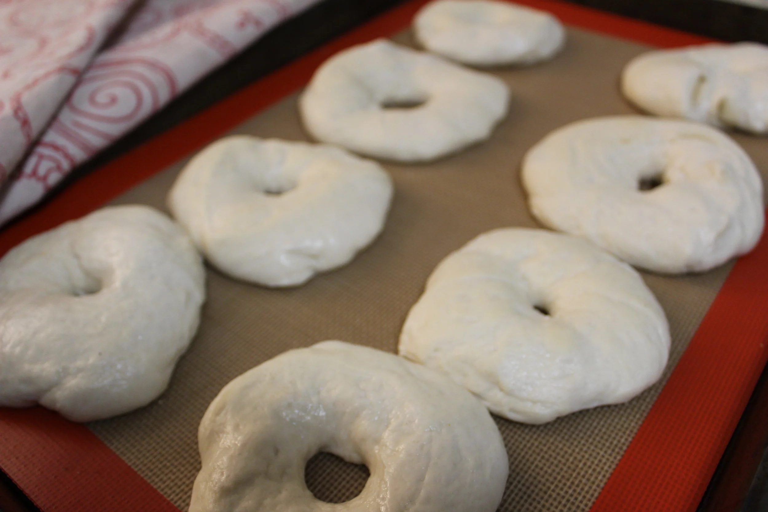 Working each dough ball one at a time poke a hole through the center and roll until a bagel shape forms. Place back onto the sheet pan. Continue to work other dough.